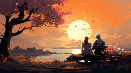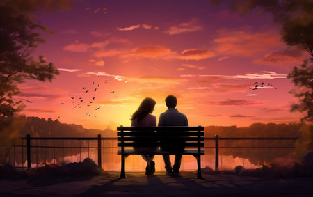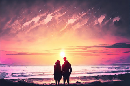 beautiful scenery of young couple looking at sunset beach , digital art style, illustration painting, fantasy concept of a young couple on the beach