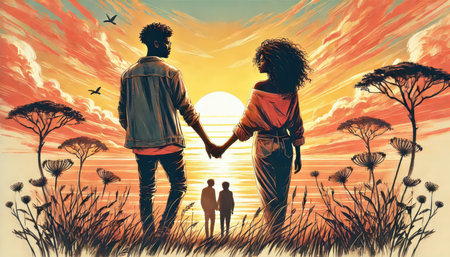 Silhouetted Couple Holding Hands, Romantic Sunset, Love and Togetherness with Copy Space