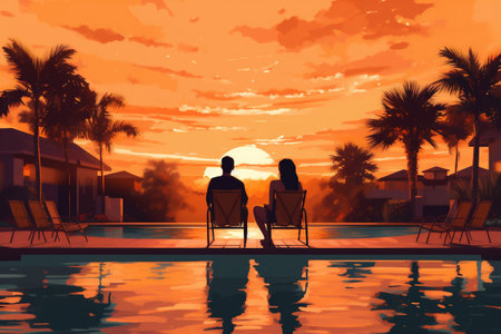 sunset pool honeymoon relax romantic couple back swimming travel vacation. Generative AI.