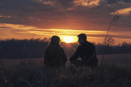 Silhouetted against a colorful sunset, a couple enjoys a quiet moment on a grassy hilltop, immersed in nature.