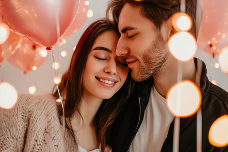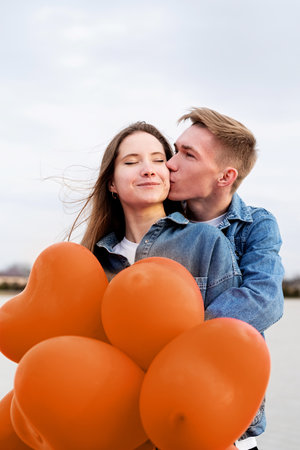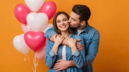 A happy couple shares a tender moment, with the man kissing the woman on the cheek, surrounded by festive heart-shaped balloons.