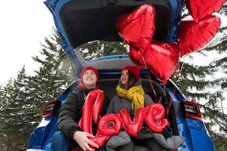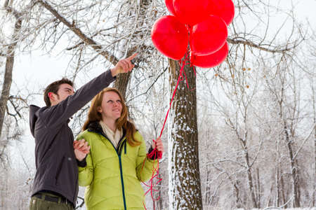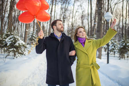 A man and a woman in love on an outdoor date in winter in the snow with a gift of pink and red balloons in the shape of a heart. Valentine's Day, love, happy couple in love on a walk