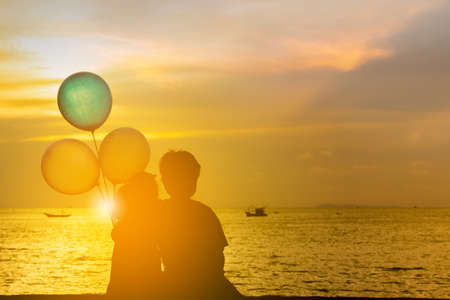 Silhouette of brother and sister sitting on the beach watching sunset with balloon in hand.