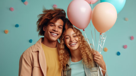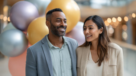 Diverse couple standing together during a celebration, sharing happiness and enjoying the festive atmosphere with colorful balloons and soft bokeh in the background