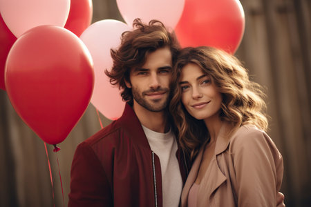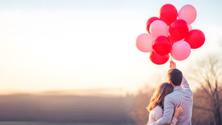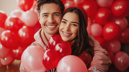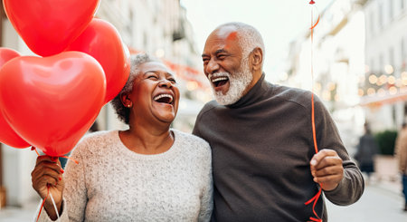 Celebrate love and laughter with this heartwarming image of joy, featuring a couple sharing smiles and red balloons. Perfect for conveying happiness and connection. Generated A.I.