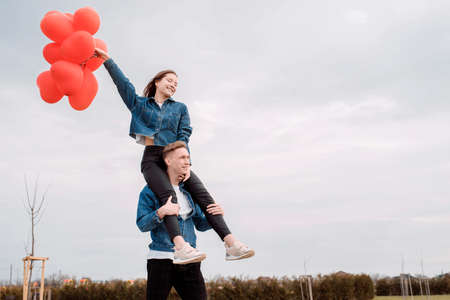 Attractive stylish young couple celebrates St. Valentines Day with red air balloons