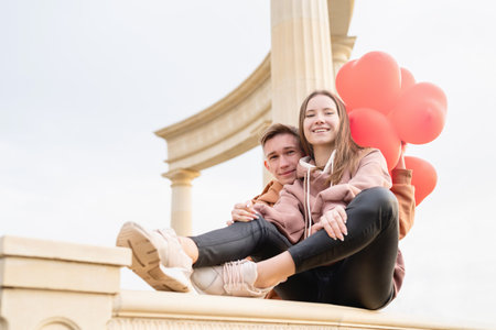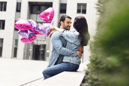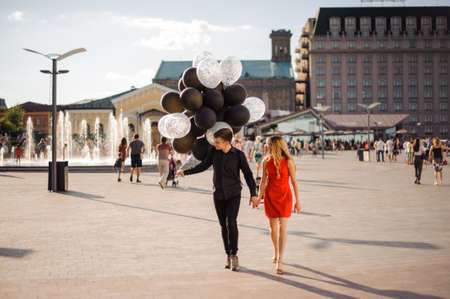 Happy couple in love on the background on town. Boy holds hand of a girl and balloons