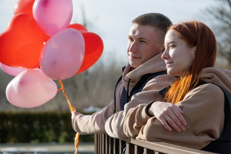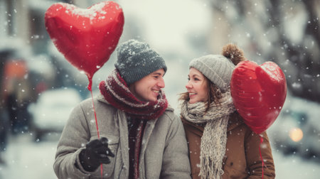 romantic date or anniversary of couple walking, spending time together at winter street. man and woman happy together, hold red air balloons in hands. celebration of saint valentines day. love concept