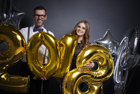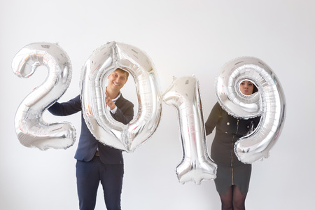 New 2019 Year is coming concept - Cheerful young man and woman are holding silver colored numbers