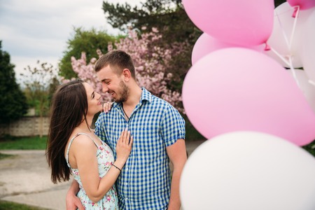Young happy couple in love outdoors. Handsome man and beautiful woman on a walk in a spring blooming park. They keep helium balls