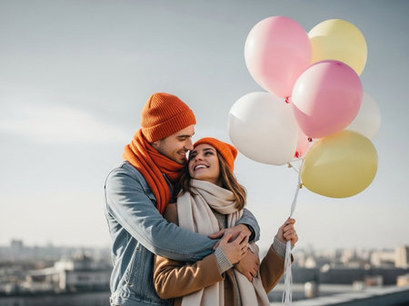A man and woman in warm clothing share a tender moment on a rooftop, surrounded by pink, yellow, and white balloons, with a cityscape in the background.