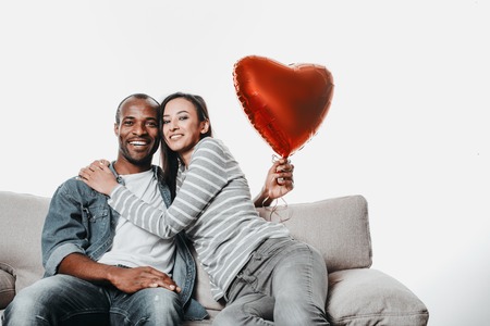 Portrait of happy enamored man and woman relaxing on couch. Guy is holding air balloon. Copy space in right side. Isolated on background