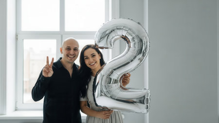 A smiling bald man and a beautiful woman hold a large silver number two balloon to celebrate their anniversary in a bright room. The man makes a peace sign.