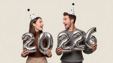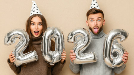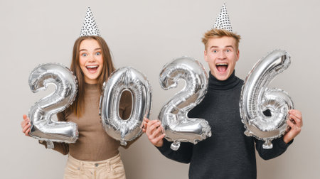 A joyful young man and woman hold silver balloons forming the numbers 2026, wearing festive party hats, ready to welcome the new year.