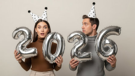 A surprised young couple wearing party hats holds silver balloons forming the year 2026, celebrating the upcoming new year with excitement.
