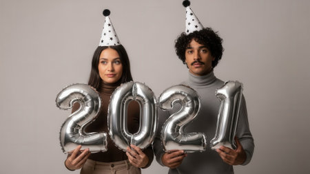 A young man and woman wearing turtlenecks and festive hats hold up shiny silver foil balloons spelling out 2021 to celebrate the new year against a plain studio background.
