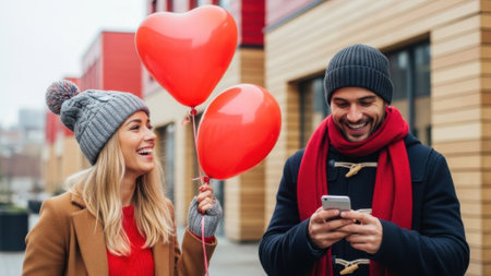 A happy couple walks together outdoors holding red heart balloons, smiling and looking at a phone.