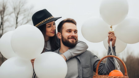 A romantic couple shares a tender moment outdoors, surrounded by white balloons and a picnic basket, suggesting a celebration or special occasion.