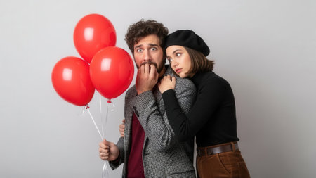 A young couple, a man and a woman, stand close together holding red balloons. The man looks worried, biting his nails, while the woman leans on his shoulder.