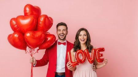 A joyful couple poses with red heart-shaped balloons and the word LOVE in balloons, celebrating romance and Valentines Day.