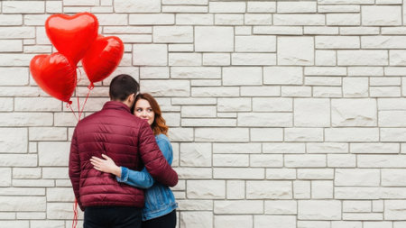 A romantic couple shares a tender moment, embracing in front of a light-colored brick wall, with three vibrant red heart-shaped balloons adding a festive touch.