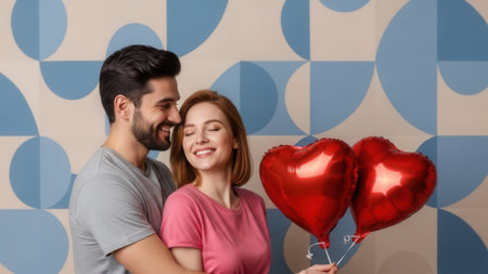 A joyful couple shares a tender moment, embracing and smiling, holding two red heart-shaped balloons against a patterned background.