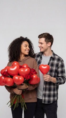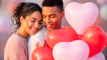 Young multi-ethnic couple smiling and celebrating valentine's day or anniversary with heart balloons
