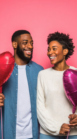 A joyful Black couple smiles warmly at each other, holding vibrant red and pink heart-shaped balloons, embodying romance and celebration.