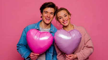 A joyful couple gazes at each other, surrounded by vibrant red heart-shaped balloons, symbolizing love and affection on a pink background.