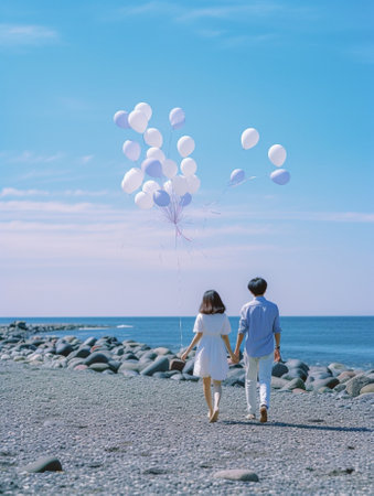 Young pretty woman in jeans shorts and handsome young man in white summer shirt holding red and white balloons and champagne at the beach Copy space : Generative AI