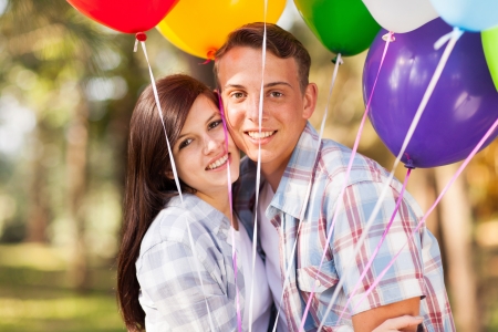 Happy young loving couple embracing each other outdoors in the park having fun holding red balloons