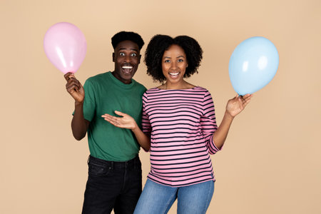 Smiling millennial african american husband and wife with big belly have fun, hold inflatable balloons
