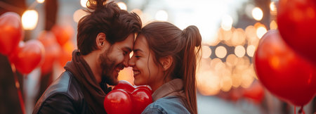 A romantic couple shares a tender moment on a city street, holding red heart-shaped balloons.