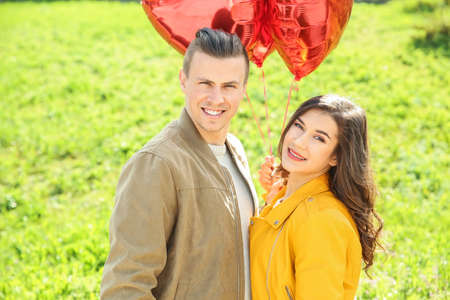 Happy young couple with heart-shaped balloons on color background. Valentine's Day concept