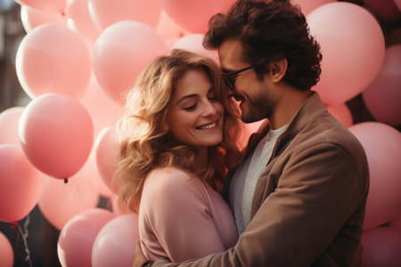 A loving couple, man and woman, embrace against backdrop of bright red balloons