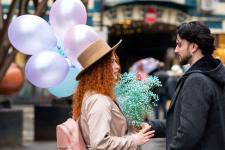 Heterosexual Couple in Love on Date on Rainy Evening. Caucasian Lovers Walks through City Streets with Bouquet Blue Flowers and Helium Balloons. Girlfriend and boyfriend look at each other