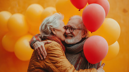 Happy senior couple celebrating anniversary or Valentine's Day against the background of balloons. Portrait of happy aged woman and man.