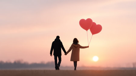 A deeply romantic image of a couple holding hands and walking away, silhouetted against a vibrant, glowing sunset sky, with two red heart balloons, perfect for Valentine's Day promotions, relationship blogs, and emotional advertising campaigns.