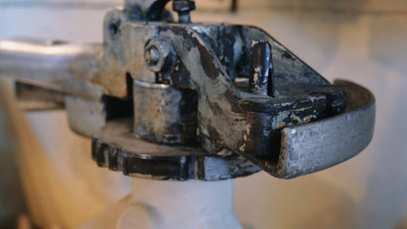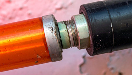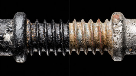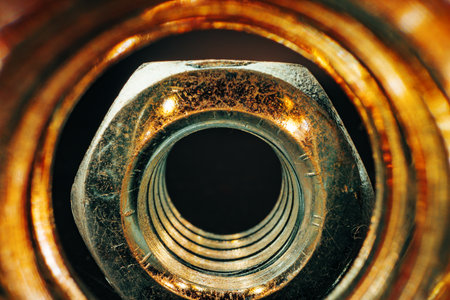 A close-up view of metallic fasteners and threads on industrial machinery showcases intricate details and textures, perfect for engineering and manufacturing themes.