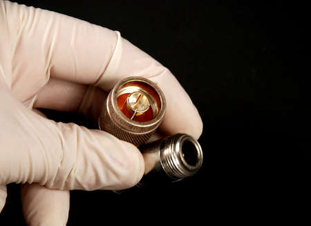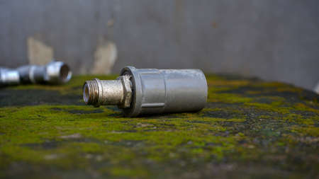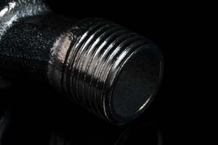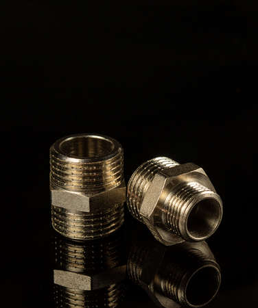 Eccentric adapter for connecting a mixer to a water pipe in a bathroom on a black mirror background close-up macro photography