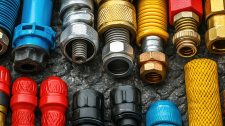 This image showcases a vibrant assortment of plumbing fittings and connectors arranged neatly on a textured surface, ideal for construction or repair projects.