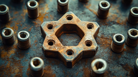 A close-up shot of a rusty metal star shape centered among hex bolts on a weathered surface, showcasing intricate details and industrial charm.