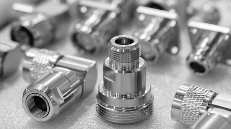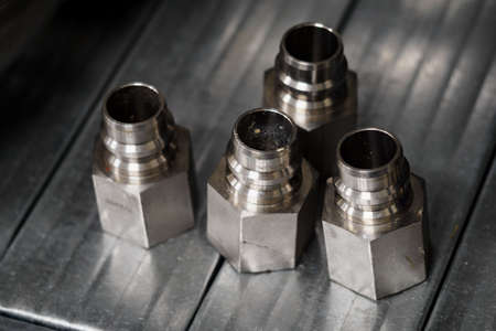 This close-up image features industrial metal fittings and connectors arranged on a dark surface. The soft lighting highlights the precision threading and metallic sheen, enhancing the visual appeal of the mechanical parts.