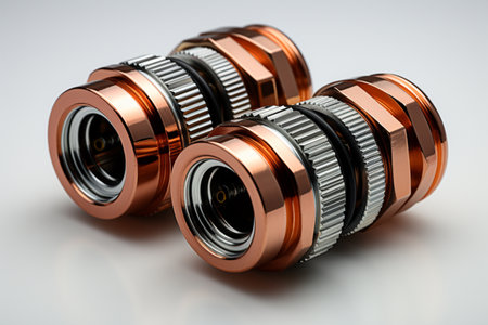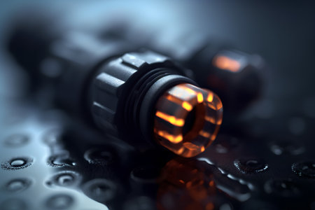 A captivating portrayal of industrial connectors captured in a captivating macro photograph, set amidst an enigmatic ambiance of darkness, where intriguing shadows