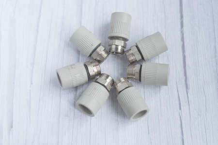 Combined couplings for connecting metal and polypropylene water pipes. Isolated nuts in circle in cold colors
