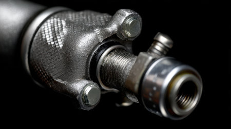 A high-resolution close-up image of a black rubber hose connector with intricate metal fittings lying on a dark background, perfect for industrial or mechanical visuals.