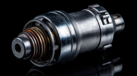 This image showcases a detailed close-up of a sleek metal fuel injector component, highlighting its intricate design and reflective surface.