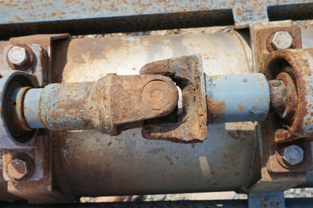 Cardan transmission of a truck transmitting torque. Drive shaft close-up
