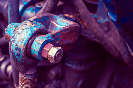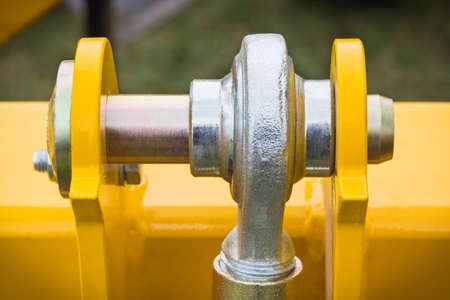 Screws and bolts as part of yellow agricultural machinery. Technology and engineering