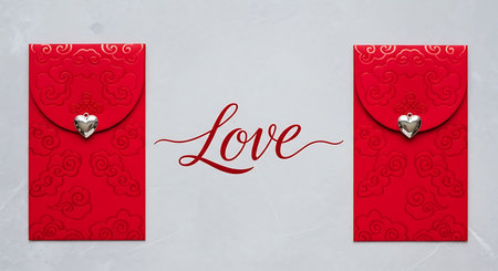 Valentine scene showing two red envelopes with silver hearts and love lettering on a gray surface